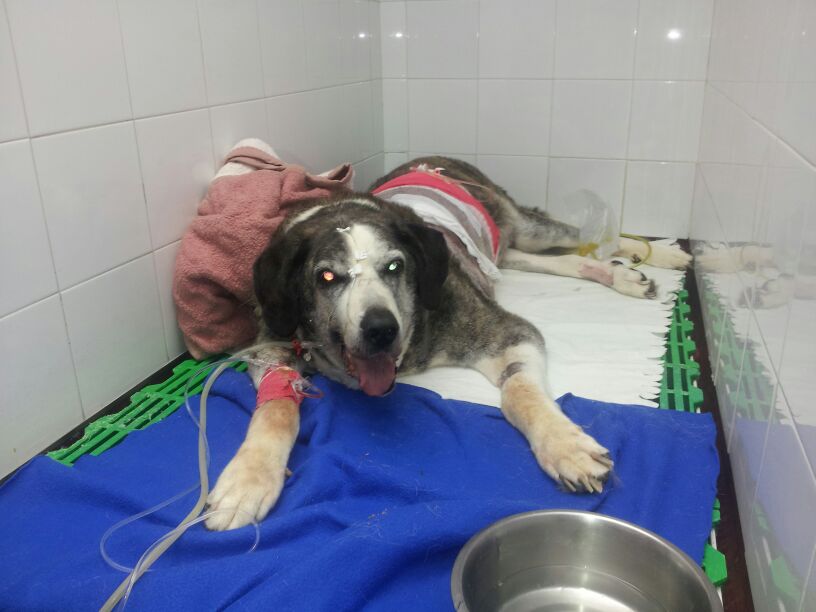 Der Höhepunkt jedoch ist Gladis. Gladis haben wir vor 5-6 Jahren adoptiert. Sie hatte einen sehr schlechten Charakter. Sie fletschte die Zähne jedem gegenüber und sie weigerte sich ins Auto zu steigen. Elena bat mich um Hilfe, um sie zum Tierarzt zu fahren, weil Gladis auf einem Bein humpelte. Sie wurde von einem Auto angefahren, aber nie zum Tierarzt gebracht. Hinzu kam, dass beim Test rauskam, dass die Ehrlichiose und evtl. auch noch Leishmaniose hatte. Sie hat mir so leid getan, dass ich sie mit nach Hause genommen habe. Juan hat sie erst mal alle Zähne gezeigt; aber nach kurzer Zeit waren sie ein Herz und eine Seele. Sechs Jahre später hat die Ehrlichiose dermaßen ihre Abwehrkräfte geschwächt, dass sie sich resistente Bakterien eingefangen hat. Nach 15 Tagen Klinik, vielen Tests und einer schweren OP, in der es um Leben und Tod ging, durften wir sie mit nach Hause nehmen, wo sie sich langsam erholt. Sie ist aber noch nicht außer Gefahr. Die Rechnung: 5.208,99 €.
